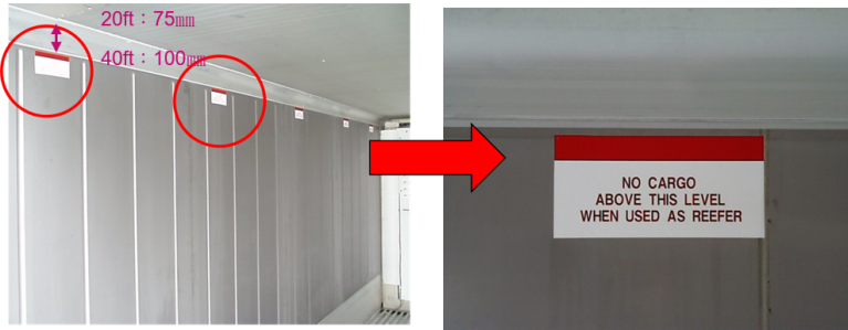 When a huge volume of cargo is loaded, the cold air circulation is entrapped, and it makes temperature control harder. There are Load Limit Mark, Red lines, to indicate the maximum loading capacity on side panels inside the container. Over loading exceeding the “Limited Lines” is prohibited. This Load Limit Mark, Red line, mounted from the ceiling to under 75mm/20ft. and 100mm/40ft. Please see below pictures.