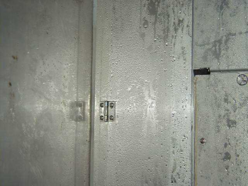 In case of precooled container, if the stuffing takes place in open environment then the difference in temperature outside and inside the container will cause moisture on all surfaces of the container when outside humid air flows in during the stuffing; which could be detrimental to cargo. (Picture below) This will dampen the cargo units and could cause the cargo to deform in stowage, possibly resulting in cargo damage.